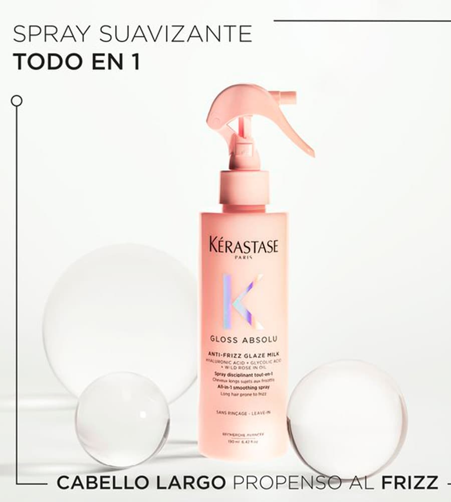 Anti-Frizz Glaze Milk de Kérastase es un spray para cabello todo en 1 para cabello largo con tendencia al frizz. Esta formulado especificamente con Ácido Hialurónico, Ácido Glicólico y Extracto de Rosa Silvestre para lograr un cabello glossy, suave e hidratado.